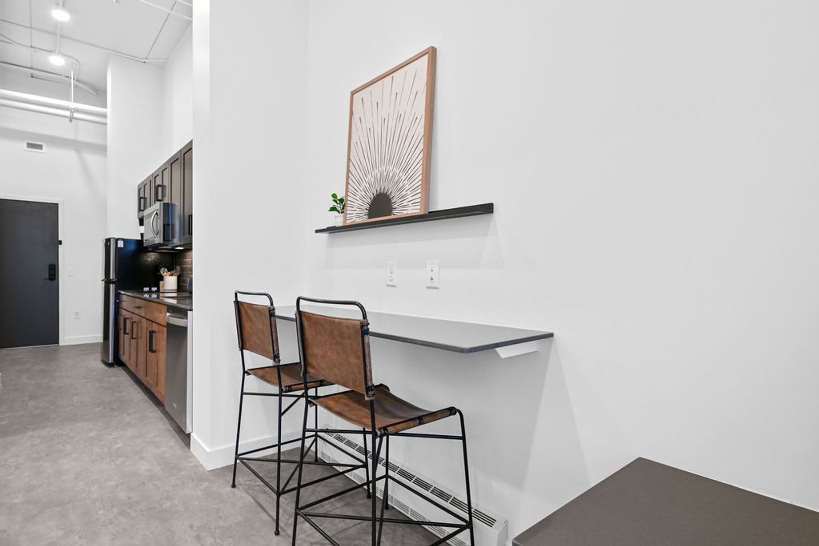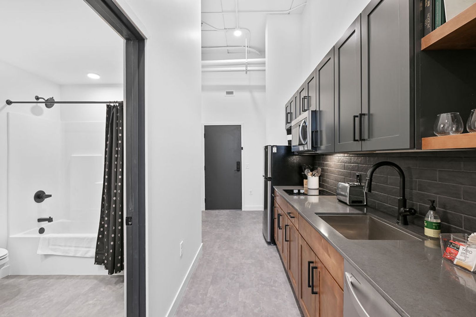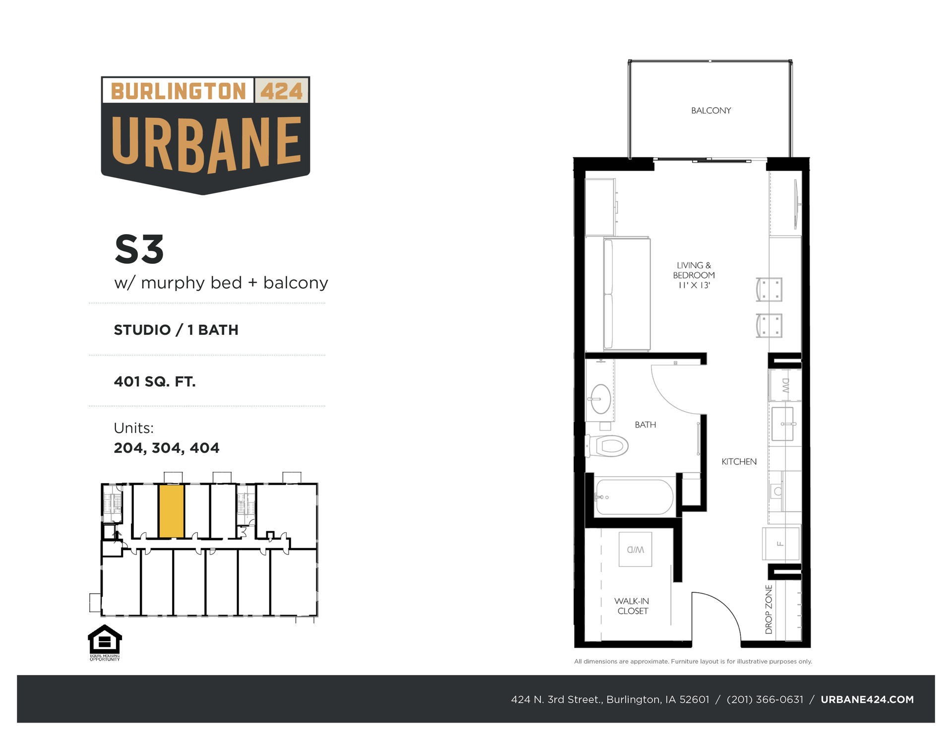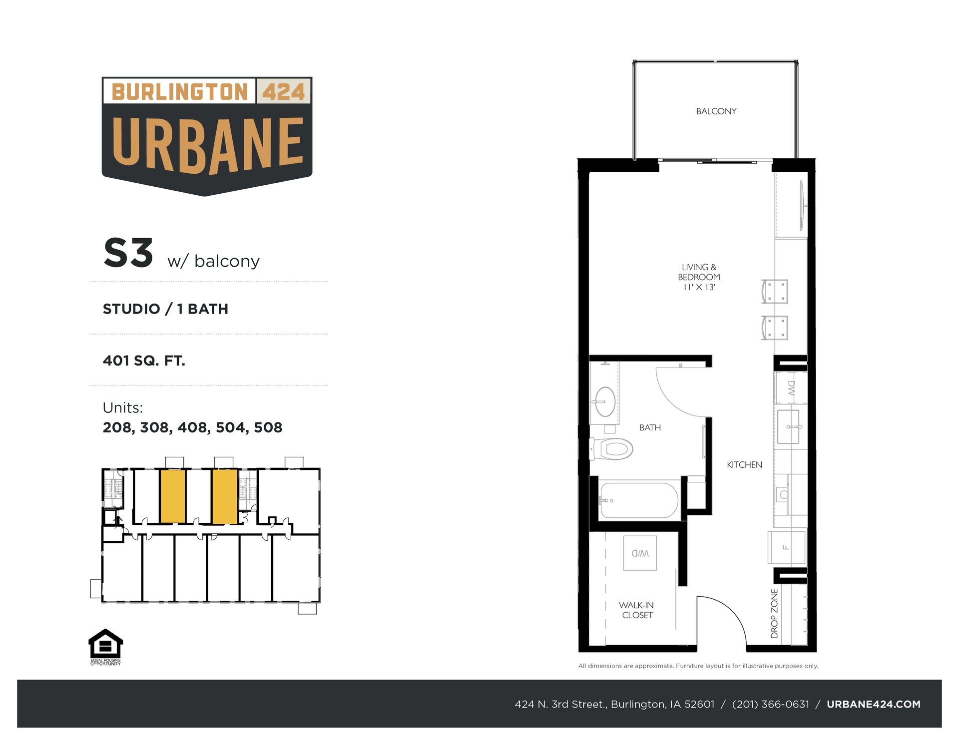 This is a studio unit in Urbane424. Urbane424 is conveniently located in downtown Burlington only blocks from the Mississippi River with access to many local establishments. This 5+-story mixed-use building features 52 residential units, a combination of studio, 1 bedroom, and 2 bedroom units, along with over 3,100 square feet of commercial space. Features of Urbane424 include a building front with an urban street space and also quieter urban green space for a variety of living options. Courtyard facing units also capture specific views of the Mississippi River and bridge. Public green space is created in the open courtyard concept and extends the pedestrian zones of the city and to stitch this project into the vibrant activity of downtown. Micro retail spaces provide frequent points of entry for pedestrian activity with the opportunity for new retail ventures to start-up in smaller footprints.