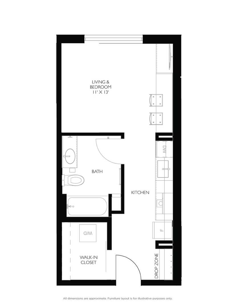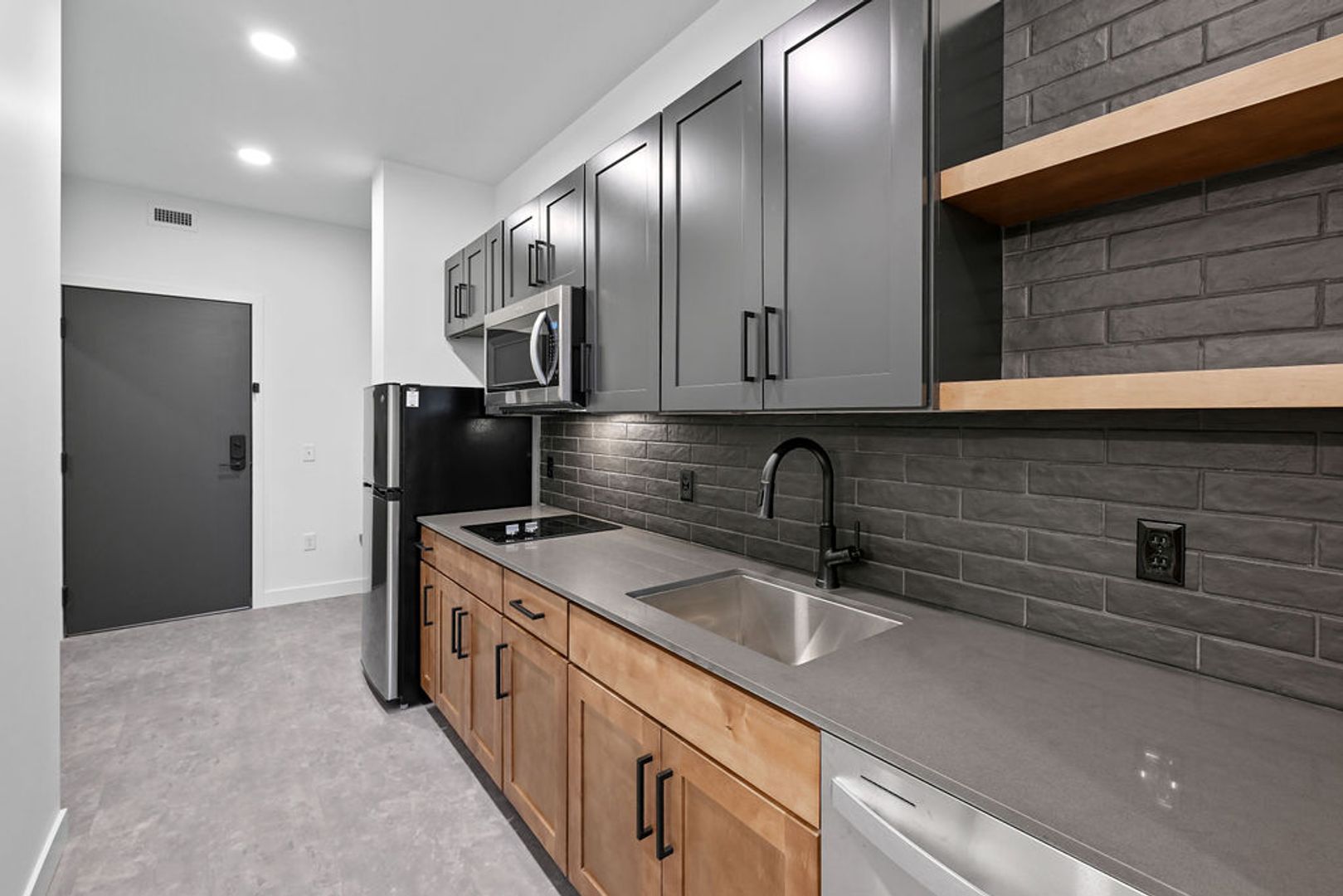 This is a studio unit in Urbane424. Urbane424 is conveniently located in downtown Burlington only blocks from the Mississippi River with access to many local establishments. This 5+-story mixed-use building features 52 residential units, a combination of studio, 1 bedroom, and 2 bedroom units, along with over 3,100 square feet of commercial space. Features of Urbane424 include a building front with an urban street space and also quieter urban green space for a variety of living options. Courtyard facing units also capture specific views of the Mississippi River and bridge. Public green space is created in the open courtyard concept and extends the pedestrian zones of the city and to stitch this project into the vibrant activity of downtown. Micro retail spaces provide frequent points of entry for pedestrian activity with the opportunity for new retail ventures to start-up in smaller footprints.